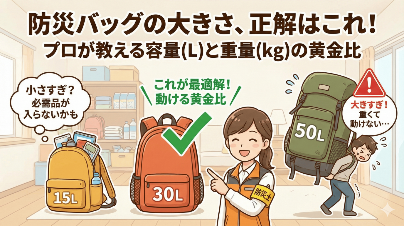 防災バッグの大きさに「正解」はありませんが、**「あなたが背負って、走って逃げられるサイズ」**が、あなたにとっての最適解です。